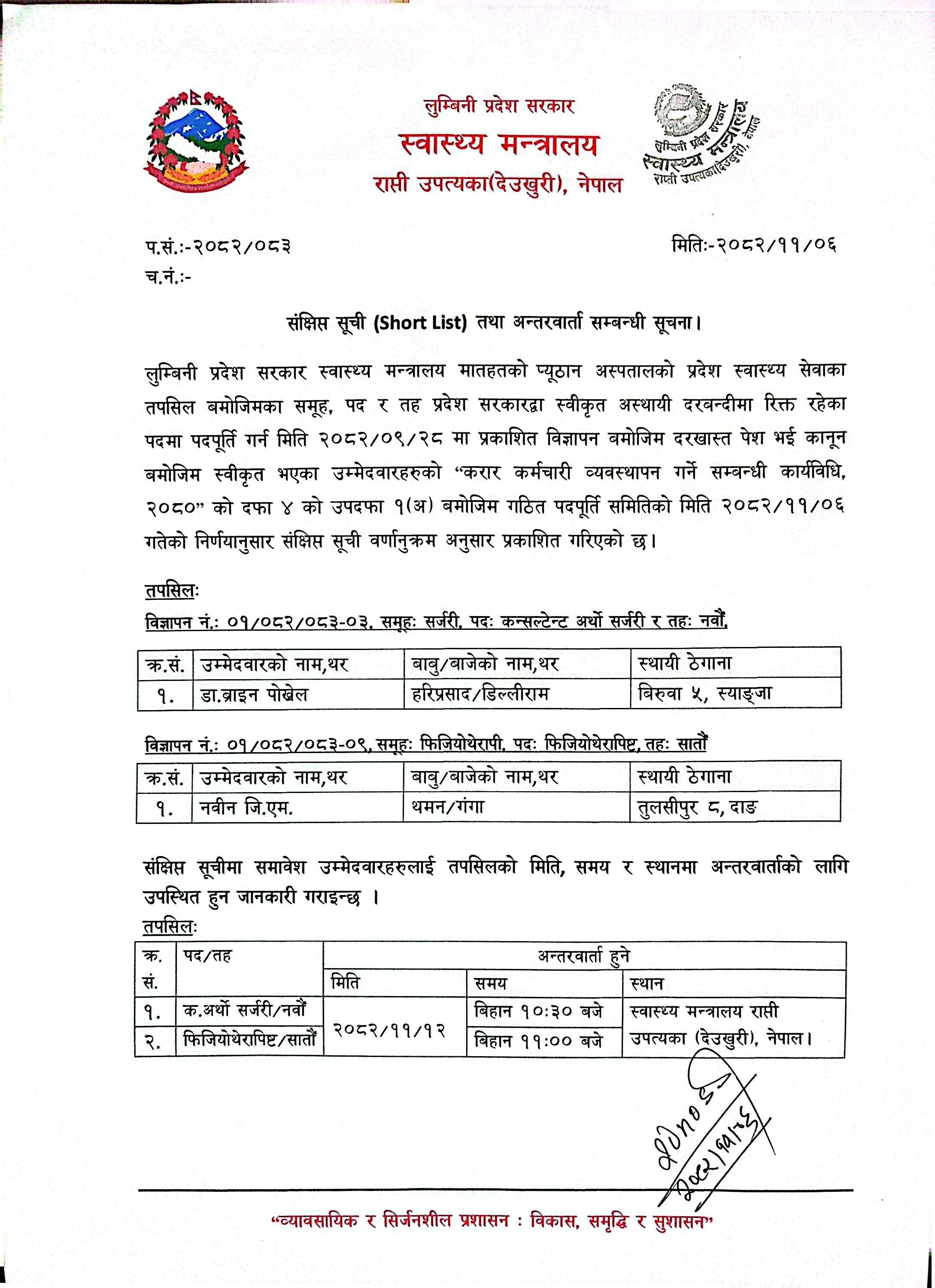 स्वास्थ्य मन्त्रालय, लुम्बिनी प्रदेश मातहतका विभिन्न अस्पतालका लागि सेवा करारमा कर्मचारी भर्नाका लागि भएको विज्ञापनमा विभिन्न तहका विभिन्न पदमा दरखास्त स्वीकृत भएका उम्मेदवारहरुको संक्षिप्त सूची तथा अन्तरवार्ता सम्बन्धी सूचना ।